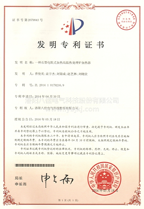 由我公司自主研發(fā)的“一種石墨電阻式加熱高溫熱處理爐熱場”、“一種石墨電阻式加熱高溫熱處理爐加熱器”,近日取得了中華人民共和國國際知識產(chǎn)權局頒發(fā)的發(fā)明專利證書。專利號分別為:ZL 2014 1 0179417.9 和ZL 2014 1 0179216.9